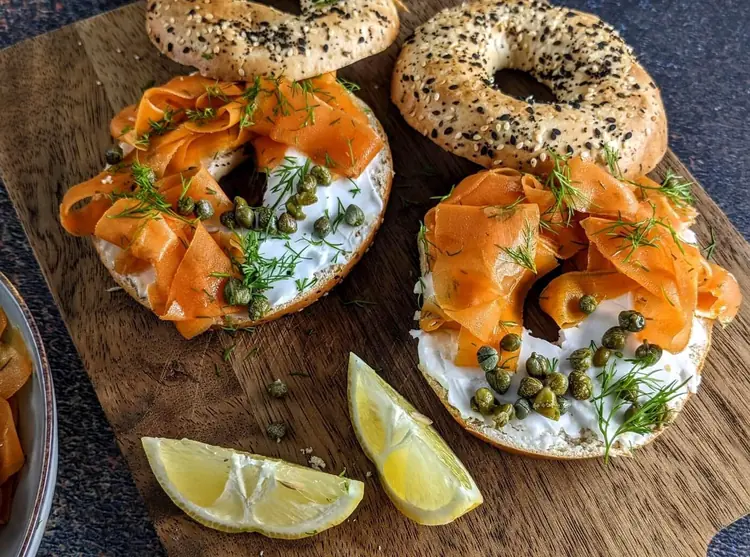 LACHS-BAGEL – Sesam-Bagel mit Mascarpone-Mousse, hausgeräuchertem Lachs, knusprigem Spinat, Hollandaise und saisonalen Sprossen. €11